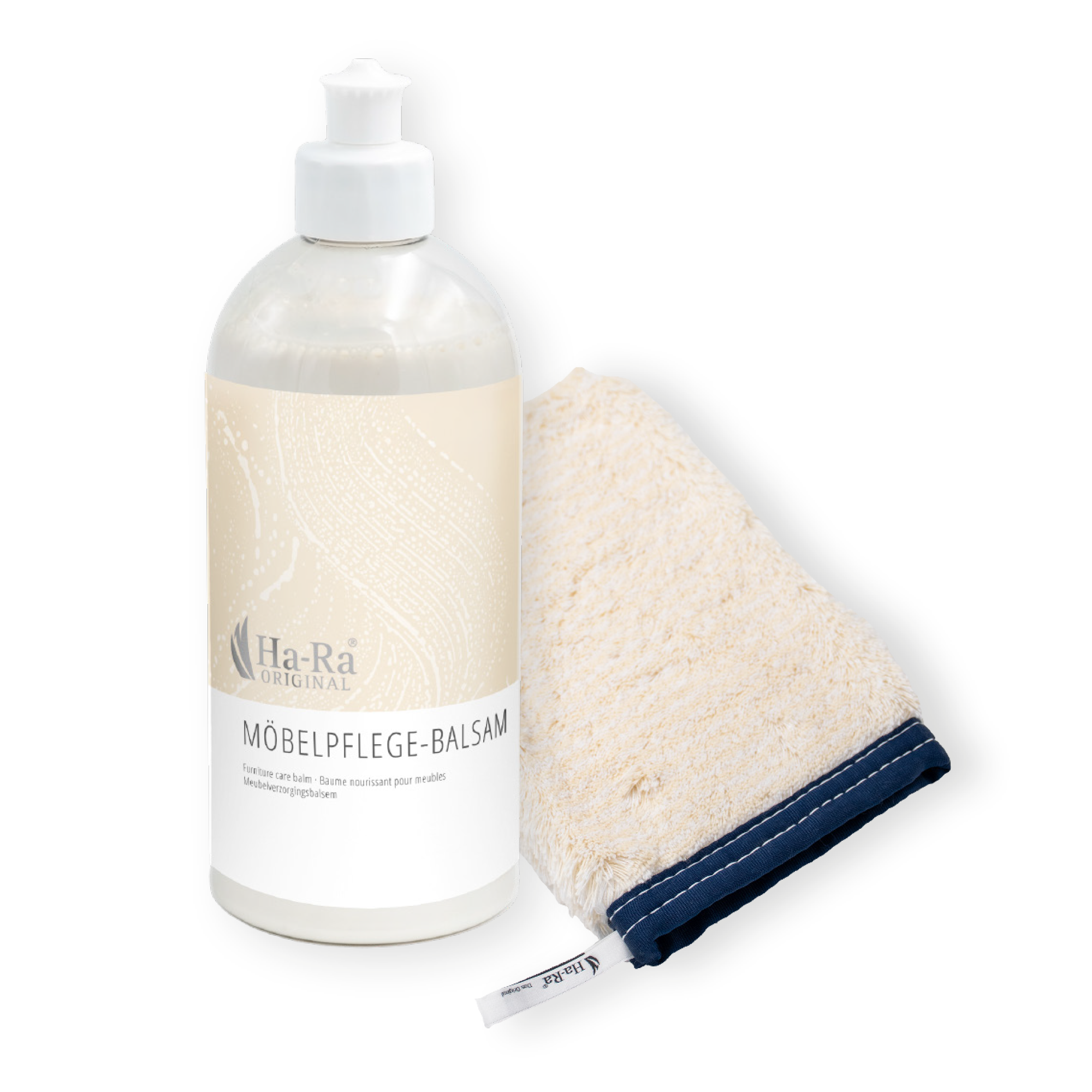 Flasche gut schütteln, Möbelpflege-Balsam auf Ha-Ra Natura-Tuch oder -Handschuh geben und in kreisenden Bewegungen dünn und gleichmäßig auftragen. Antrocknen lassen.